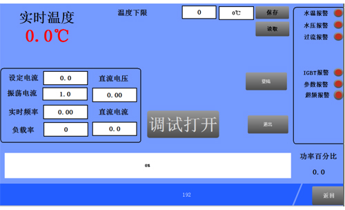 本電源有負載自適應功能,在不上主電狀態(tài)下,調(diào)整好負載之后,在電源內(nèi)控模式下加熱,上位顯示屏自動給出負載的匹配狀態(tài)及諧振頻率供用戶參考調(diào)試。